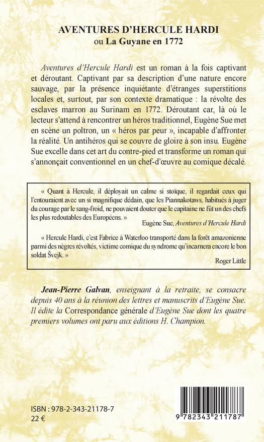 Aventures d'Hercule Hardi est un roman à la fois captivant et déroutant. Captivant par sa description d'une nature encore sauvage, par la présence inquiétante d'étranges superstitions locales et, surtout, par son contexte dramatique : la révolte des esclaves marron au Surinam en 1772. Déroutant car, là où le lecteur s'attend à rencontrer un héros traditionnel, Eugène Sue met en scène un poltron, un « héros par peur », incapable d'affronter la réalité. Un antihéros qui se couvre de gloire à son insu. Eugène Sue excelle dans cet art du contre-pied et transforme un roman qui s'annonçait conventionnel en un chef-d'oeuvre au comique décalé.