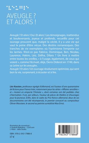 Aveugle ? Et alors ! Oui. Et alors ! Les témoignages, inattendus et bouleversants, joyeux et profonds, recueillis pour cet ouvrage prouvent que, malgré la cécité, il y a une vie qui vaut la peine d'être vécue. Des destins romanesques. Des tranches de vie exemplaires où l'optimisme l'emporte sur les larmes. Un livre à mettre entre toutes les oreilles, « à l'usage, également, de ceux qui voient », comme l'écrivait, déjà, Denis Diderot en 1749, dans sa Lettre sur les aveugles. Aveugle ? Et alors ! Un ouvrage résolument optimiste, qui sent bon la vie, surprenant, à écouter et à lire.