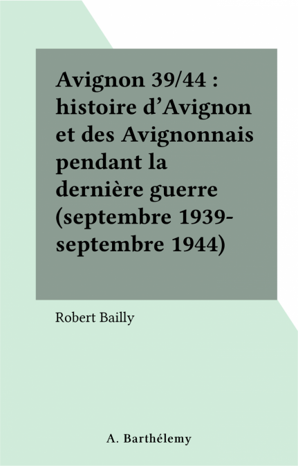 1946 - Robert Bailly publie à chaud : « Avignon meurtrie ». Cet ouvrage — on en devine les raisons — devient très vite introuvable en librairie. 1986 - Cette nouvelle édition s’imposait. Elle complète la précédente de textes que le recul du temps permet de mieux comprendre. En outre, l’auteur durant de nombreuses années n’a cessé de fouiller les mémoires, les témoignages, les archives nationales ou étrangères, avant de présenter au public un livre suffisamment riche d’enseignements. C’est ainsi que bon nombre de documents originaux et inédits, provenant des fonds de l’U.S. Air Force et des centres de commandement allemands, l’étoffent considérablement. Le chapitre consacré aux bombardements qu’a subis notre ville est d’autant plus édifiant que les zones touchées sont connues de nous tous ; de ce fait, notre sensibilité n’en est que plus exacerbée. Avec Robert Bailly, les témoins — actifs ou non — se retrouveront dans cette triste époque de l’Occupation mais aussi, et surtout, les générations qui ont succédé découvriront les faits, objectivement relatés, et les événements qui ont marqué cette période à travers la vie avignonnaise. L’ÉDITEUR
