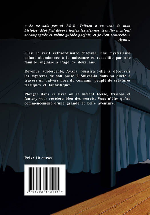 C’est le récit extraordinaire d’Ayana, une mystérieuse enfant abandonnée à la naissance et recueillie par une famille anglaise à l’âge de deux ans. Devenue adolescente, Ayana réussira-t-elle à découvrir les mystères de son passé ? Suivez-la dans sa quête à travers un univers hors du commun, peuplé de créatures féériques et fantastiques. Plonger dans ce livre où se mêlent féérie, frissons et fantasy vous révèlera bien des secrets. Vous n’êtes qu’au commencement d’une grande et belle aventure.