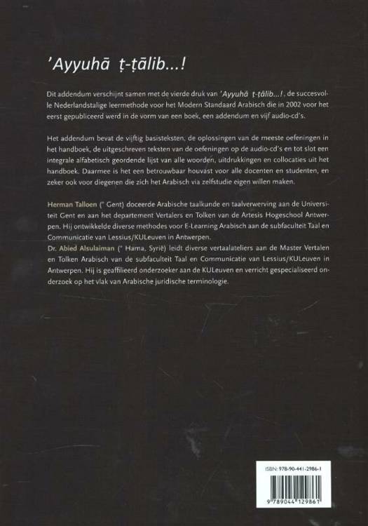 Dit addendum verschijnt samen met de vierde druk van Ayyuha t-talib...!, de succesvolle Nederlandstalige leermethode voor het Modern Standaard Arabisch. Het addendum bevat de vijftig basisteksten, de oplossingen van de meeste oefeningen in het handboek, de uitgeschreven teksten van de oefeningen op de audio-cd’s en tot slot een integrale alfabetisch geordende lijst van alle woorden, uitdrukkingen en collocaties uit het handboek. Daarmee is het een betrouwbaar houvast voor alle docenten en studenten, en zeker ook voor diegenen die zich het Arabisch via zelfstudie eigen willen maken.