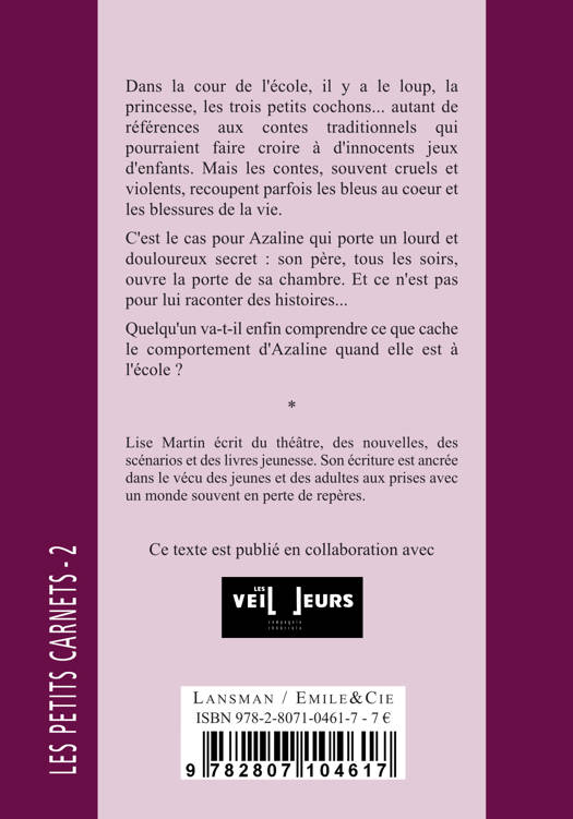 Dans la cour de l'école, il y a le loup, la princesse, les trois petits cochons… autant de références aux contes traditionnels qui pourraient faire croire à d'innocents jeux d'enfants. Mais les contes, souvent cruels et violents, recoupent parfois les bleus au cœur et les blessures de la vie. C'est le cas pour Azaline qui porte un lourd et douloureux secret : son père, tous les soirs, ouvre la porte de sa chambre. Et ce n'est pas pour lui raconter des histoires… Quelqu'un va-t-il enfin comprendre ce que cache le comportement d'Azaline quand elle est à l'école ?