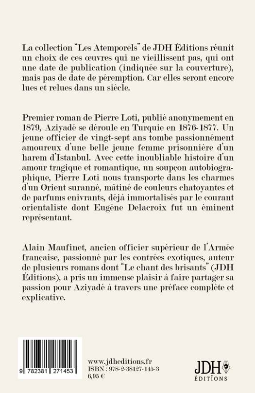 La collection «Les Atemporels» de JDH Éditions réunit un choix de ces oeuvres qui ne vieillissent pas, qui ont une date de publication (indiquée sur la couverture), mais pas de date de péremption. Car elles seront encore lues et relues dans un siècle. Premier roman de Pierre Loti, publié anonymement en 1879, Aziyadé se déroule en Turquie en 1876-1877. Un jeune officier de vingt-sept ans tombe passionnément amoureux d'une belle jeune femme prisonnière d'un harem d'Istanbul. Avec cette inoubliable histoire d'un amour tragique et romantique, un soupçon autobiographique, Pierre Loti nous transporte dans les charmes d'un Orient suranné, mâtiné de couleurs chatoyantes et de parfums enivrants, déjà immortalisés par le courant orientaliste dont Eugène Delacroix fut un éminent représentant. Alain Maufinet, ancien officier supérieur de l'Armée française, passionné par les contrées exotiques, auteur de plusieurs romans dont «Le chant des brisants» (JDH Éditions), a pris un immense plaisir à faire partager sa passion pour Aziyadé à travers une préface complète et explicative.
