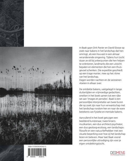 De ontdekte bakens, vastgelegd in lange sluitertijden en vrijmoedige gedachten, smelten in het boek samen tot een rijke set aan ‘images et pensées’. Baak is een persoonlijke interpretatie van twee buren die op zoek zijn naar hun verwantschap met het landschap rondom hen en naar de ware betekenis van fysieke en mentale bakens.