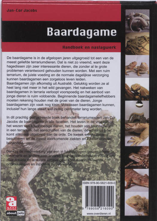 In dit prachtig geïllustreerde boek behandelt terrariumexpert Jan-Cor Jacobs de baardagame in alle facetten. Het leven in de vrije natuur, het wezen van koudbloedige dieren, het houden van baardagamen in een terrarium, het aanschaffen van de dieren, de winterrust; het komt allemaal uitgebreid aan de orde. De kweek wordt uitvoerig beschreven en de meest voorkomende ziekten en kwalen worden behandeld.