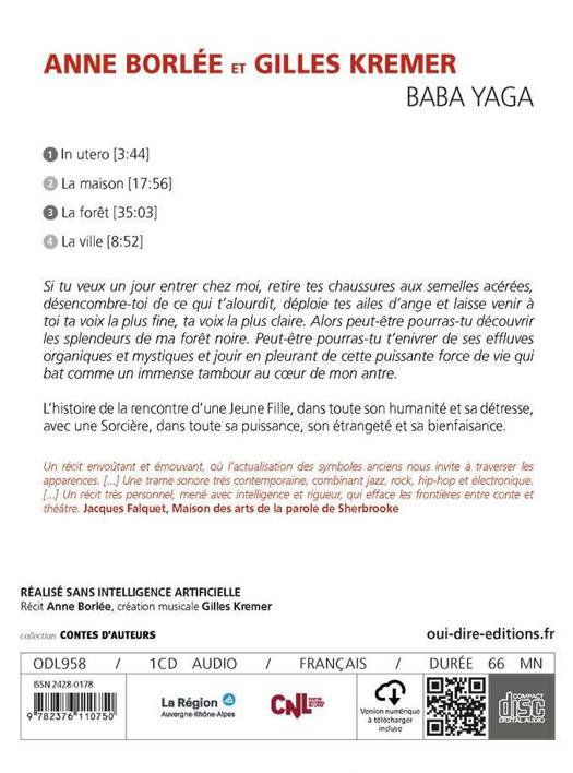 Si tu veux un jour entrer chez moi, retire tes chaussures aux semelles acérées, désencombre-toi de ce qui t'alourdit, déploie tes ailes d'ange et laisse venir à toi ta voix la plus fine, ta voix la plus claire. Alors peut-être pourras-tu découvrir les splendeurs de ma forêt noire. Peut-être pourras-tu t'enivrer de ses effluves organiques et mystiques et jouir en pleurant de cette puissante force de vie qui bat comme un immense tambour au coeur de mon antre. L'histoire de la rencontre d'une Jeune Fille, dans toute son humanité et sa détresse, avec une Sorcière, dans toute sa puissance, son étrangeté et sa bienfaisance... Un récit envoûtant et émouvant, où l'actualisation des symboles anciens nous invite à traverser les apparences. [...] Une trame sonore très contemporaine, combinant jazz, rock, hip-hop et électronique.[...] Un récit très personnel, mené avec intelligence et rigueur, qui efface les frontières entre conte et théâtre. Jacques Falquet, Maison des arts de la parole