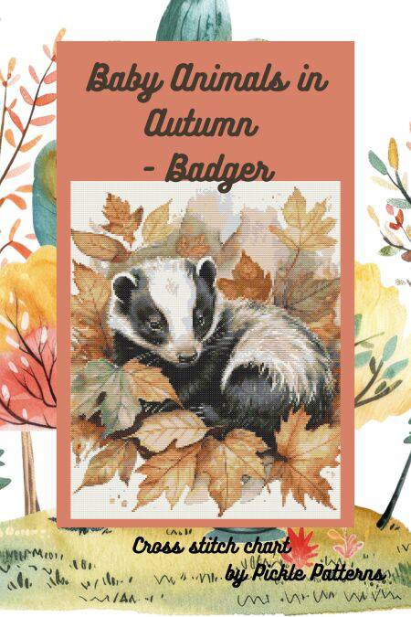 The image is a cross-stitch artwork depicting a young badger nestled comfortably amongst a profusion of autumn leaves. The badger is the central focus, its body positioned slightly off-centre. Its fur is meticulously detailed, showing a contrasting pattern of black and white; a distinctive white stripe runs down its face from its forehead to the tip of its nose. The badger's eyes are small and dark, and its expression is calm and peaceful, almost sleepy. Its tail, thick and bushy, is curled slightly towards its body, adding to the impression of relaxation.
