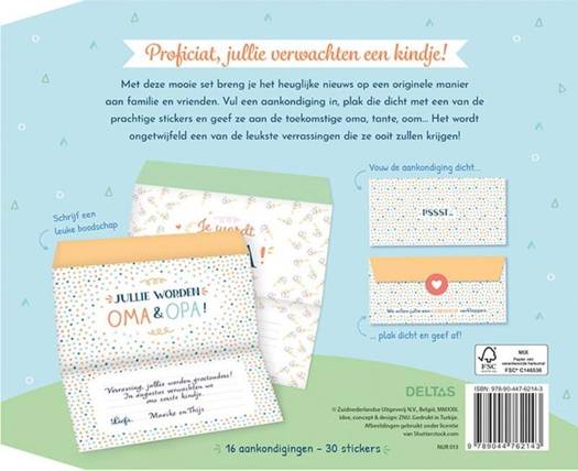 Breng het nieuws van jullie zwangerschap op een originele manier aan familie en vrienden met deze mooie set van 16 uitscheurbare aankondigingskaarten. Vul een aankondiging in, vouw en plak die dicht met een van de 30 prachtige stickers en geef ze aan de toekomstige oma, tante, oom... Het wordt ongetwijfeld een van de leukste verrassingen die ze ooit zullen krijgen!