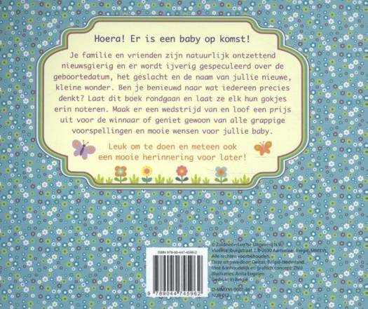 Hoera! Er is een baby op komst! Je familie en vrienden zijn natuurlijk ontzettend nieuwsgierig en er wordt ijverig gespeculeerd over de geboortedatum, het geslacht en de naam van jullie nieuwe, kleine wonder. Ben je benieuwd naar wat iedereen precies denkt? Laat dit boek rondgaan en laat ze elk hun gokjes erin noteren. Maak er een wedstrijd van en loof een prijs uit voor de winnaar of geniet gewoon van alle grappige voorspellingen en mooie wensen voor jullie baby. Leuk om te doen en meteen ook een mooie herinnering voor later!