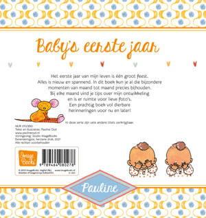 Geheel vernieuwd invulboek van Pauline Oud: Baby's eerste jaar. Met frisse illustraties en vrolijke patronen.