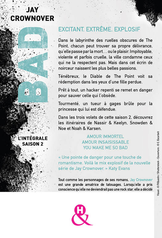 À propos de l'autrice Tout comme les personnages de ses romans, Jay Crownover est une grande amatrice (et collectionneuse !) de tatouages. Lorsqu’elle a pris conscience qu’elle ne deviendrait pas la rock star qu’elle rêvait d’être depuis ses huit ans, elle a décidé d’embrasser son autre passion : l’écriture. Elle est l'autrice des séries à succès "Bad", "Marked Men" et "Clash".