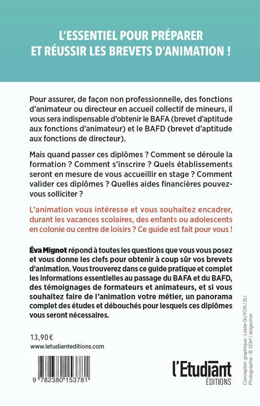 Éva Mignot répond à toutes les questions que vous vous posez et vous donne les clefs pour obtenir à coup sûr vos brevets d'animation. Vous trouverez dans ce guide pratique et complet les informations essentielles au passage du BAFA et du BAFD, des témoignages de formateurs et animateurs, et si vous souhaitez faire de l'animation votre métier, un panorama complet des études et débouchés pour lesquels ces diplômes vous seront nécessaires.