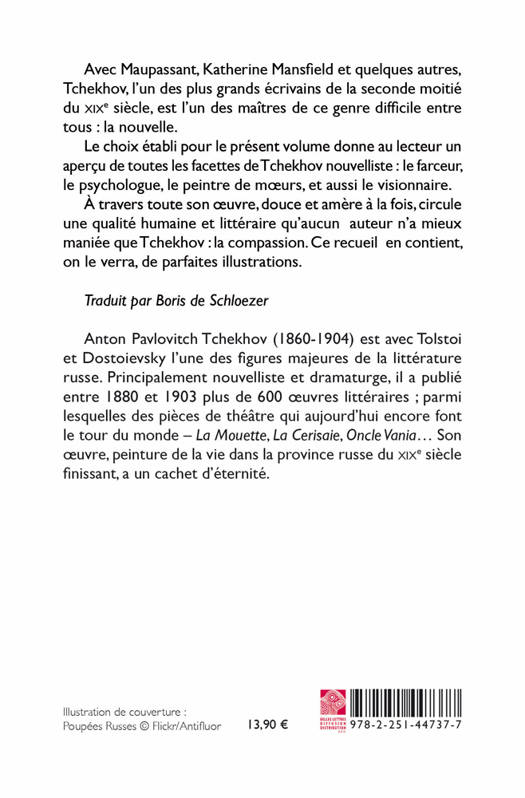 Avec Maupassant, Katherine Mansfield et quelques autres, Tchekhov, l'un des plus grands ecrivains de la seconde moitie du XIXe siecle, est l'un des maitres de ce genre difficile entre tous: la nouvelle. Le choix etabli pour le present volume donne au lecteur un apercu de toutes les facettes de Tchekhov nouvelliste: le farceur, le psychologue, le peintre de moeurs, et aussi le visionnaire. A travers toute son oeuvre, douce et amere a la fois, circule une qualite humaine et litteraire qu'aucun auteur n'a mieux maniee que Tchekhov: la compassion. Ce recueil en contient, on le verra, de parfaites illustrations.