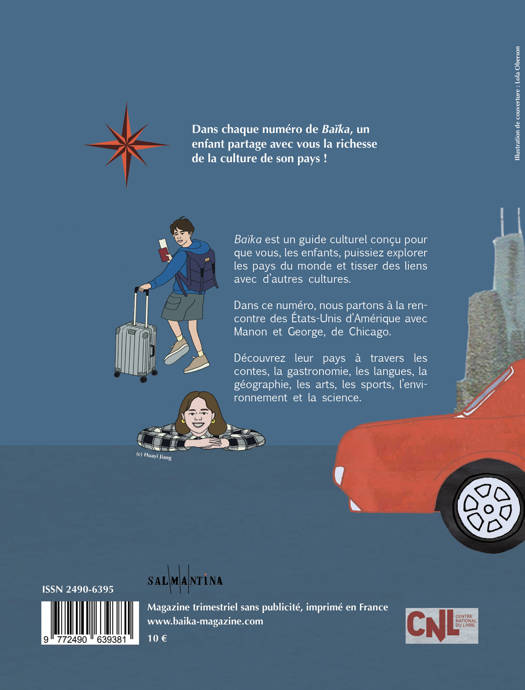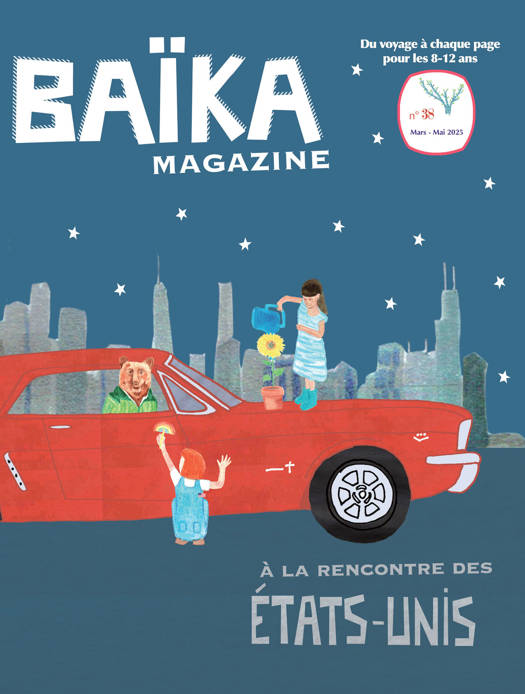 Dans ce numéro, le magazine Baïka emmène les enfants à la rencontre de la culture américaine, en compagnie des jeunes Manon et George de Chicago. Savez-vous qu’il existe un haricot géant à Chicago ? Et un tyrannosaure qui s’appelle Sue ? Avez-vous déjà goûté une American pie ? Bonne lecture !