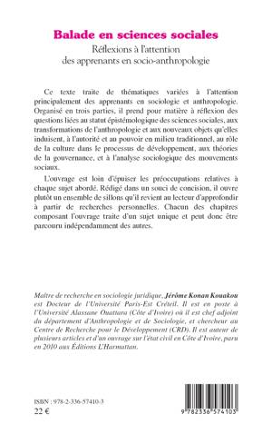 Ce texte traite de thématiques variées à l'attention principalement des apprenants en sociologie et anthropologie. Organisé en trois parties, il prend pour matière à réflexion des questions liées au statut épistémologique des sciences sociales, aux transformations de l'anthropologie et aux nouveaux objets qu'elles induisent, à l'autorité et au pouvoir en milieu traditionnel, au rôle de la culture dans le processus de développement, aux théories de la gouvernance, et à l'analyse sociologique des mouvements sociaux. L'ouvrage est loin d'épuiser les préoccupations relatives à chaque sujet abordé. Rédigé dans un souci de concision, il ouvre plutôt un ensemble de sillons qu'il revient au lecteur d'approfondir à partir de recherches personnelles. Chacun des chapitres composant l'ouvrage traite d'un sujet unique et peut donc être parcouru indépendamment des autres.