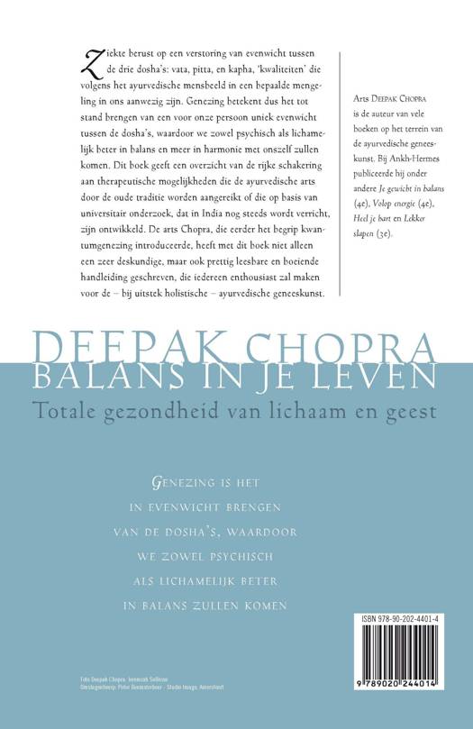Deepak Chopra heeft met Balans in je leven niet alleen een zeer deskundige, maar ook een prettig leesbare en boeiende handleiding geschreven die iedereen enthousiast zal maken voor de - bij uitstek holistische - ayurvedische geneeskunst. Ziekte berust volgens hem op een verstoring van evenwicht tussen de drie dosha's: vata, pitta, en kapha, 'kwaliteiten' die volgens het ayurvedische mensbeeld in een bepaalde mengeling in ons aanwezig zijn. Genezing betekent dus het tot stand brengen van een voor onze persoon uniek evenwicht tussen de dosha's, waardoor we zowel psychisch als lichamelijk beter in balans en meer in harmonie met onszelf zullen komen. Balans in je leven geeft een overzicht van de rijke schakering aan therapeutische mogelijkheden die de ayurvedische arts door de oude traditie worden aangereikt of die op basis van universitair onderzoek, dat in India nog steeds wordt verricht, zijn ontwikkeld.