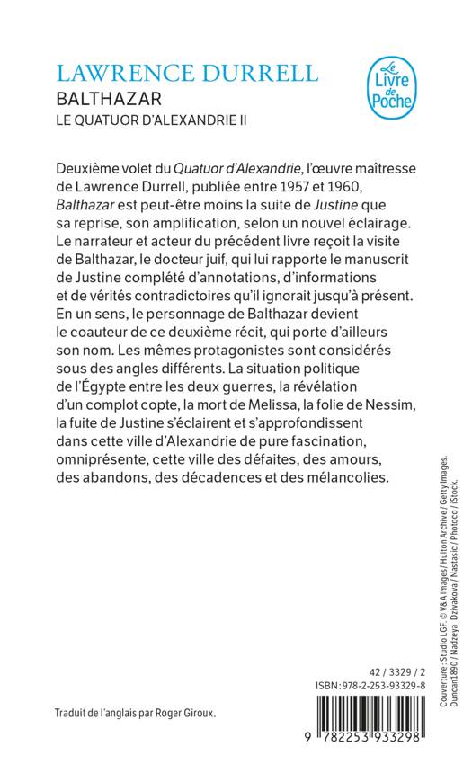Deuxième volet du Quatuor d’Alexandrie, l’œuvre maîtresse de Lawrence Durrell, publiée entre 1957 et 1960, Balthazar est peut-être moins la suite de Justine que sa reprise, son amplification, selon un nouvel éclairage. Le narrateur et acteur du précédent livre reçoit la visite de Balthazar, le docteur juif, qui lui rapporte le manuscrit de Justine complété d’annotations, d’informations et de vérités contradictoires, qu’il ignorait jusqu’à présent. En un sens, le personnage de Balthazar devient le coauteur de ce second récit qui porte d’ailleurs son nom.