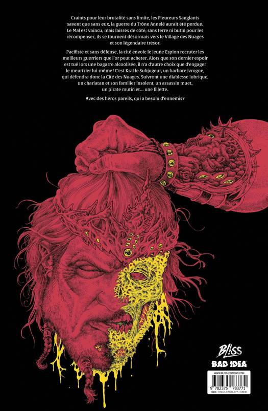 Craints pour leur brutalité sans limite, les Pleureurs Sanglants savent que sans eux, la guerre du Trône Annelé aurait été perdue. Le Mal est vaincu, mais laissés de côté, sans terre ni butin pour les récompenser, ils se tournent désormais vers le Village des Nuages et son légendaire trésor. Pacifiste et sans défense, la cité envoie le jeune Espion recruter les meilleurs guerriers que l'or peut acheter. Alors que son dernier espoir est tué lors une bagarre alcoolisée, il n'a d'autre choix que d'engager le meurtrier lui-mêmeâ! C'est Kral le Subjugeur, un barbare ivrogne, qui défendra donc la Cité des Nuages. Suivront une diablesse lubrique, un charlatan et son familier insolent, un assassin muet, un pirate mutin et⦠une fillette. Avec des héros pareils, qui a besoin d'ennemisâ?