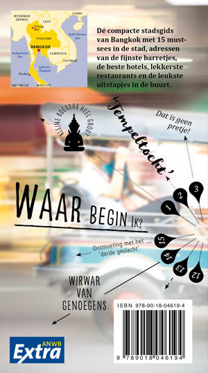 ANWB Extra reisgids Bangkok - Thailand Beleef Bangkok met de vernieuwde reisgids ANWB Extra Bangkok! Wie voor het eerst Bangkok bezoekt, kan overweldigd worden door de verkeerschaos, de voorbij scheurende tuktuks en het klamme klimaat. Geen nood, met de ANWB Extra reisgids Bangkok op zak ben je goed voorbereid. De gids biedt naast heel veel praktische tips over hotels, vervoer en restaurants ook 15 inspirerende bezienswaardigheden die je niet mag missen. Bezoek het Koninklijk Paleis, waar vanaf 1782 Thaise koningen woonden. Leer de Thai kennen in het Museum van Siam of duik het nachtleven in, dat veel meer biedt dan alleen gogobars. Deze kleine reisgids past gemakkelijk in de tas en heeft een handige uitneembare kaart met daarop de beste tips voor overnachten, winkelen, eten en drinken en uitgaan.