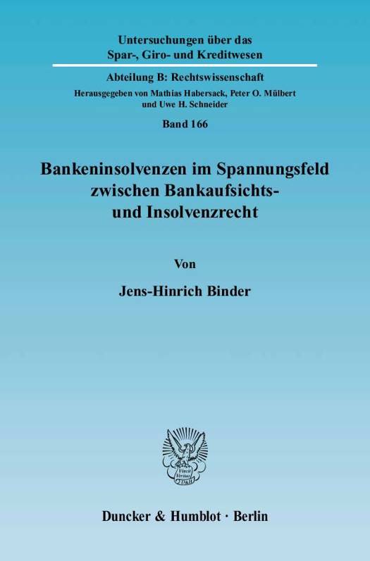 Der Verfasser untersucht, inwieweit die Bedeutung der Banken für die Volkswirtschaft eine privilegierte Stellung in der Insolvenz tatsächlich rechtfertigt. Ausgestaltung und Funktionsweise der Spezialregelungen im deutschen und englischen Recht werden ermittelt und einander gegenübergestellt. Ein besonderes Augenmerk gilt Sonderproblemen wie der Vernetzung der Banken in Zahlungssystemen, der Behandlung von Finanzkontrakten sowie der Bedeutung von Einlagensicherungssystemen in der Insolvenz. Die aufsichtsrechtlichen Spezialverfahren und das allgemeine Insolvenzrecht werden miteinander verglichen und auf ihre Leistungsfähigkeit überprüft. Jens-Hinrich Binder gelangt zu dem Ergebnis, daß die herrschende These von der Untauglichkeit des allgemeinen Insolvenzrechts für die Probleme einer Bankeninsolvenz nicht überzeugt und daß diesen auch durch punktuelle Anpassungen im allgemeinen Insolvenzrecht genügt werden kann. Das Ergebnis wird abgesichert durch den Rechtsvergleich mit England, wo ein dem deutschen Recht entsprechendes Sonderverfahren nicht existiert.