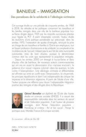 Cet ouvrage étudie sur une période de cinquante années, de 1968 à 2018, les attitudes et les politiques concernant les travailleurs et les familles immigrés dans une ville de la banlieue populaire Ivry-sur-Seine dirigée depuis 1925 par les majorités successives placées sous l'égide du PCF. À partir d'exemples concrets, l'auteur étudie les évolutions d'une politique paradoxale qui préconisait, dans les années 1970, l'instauration de quotas d'immigrés, renvoyait la prise en charge de ces travailleurs et familles à l'État et aux employeurs. Depuis les annés 2000 ont émergé à Ivry et ailleurs de nouveaux acteurs communautaires qui ont mis en avant la dénonciation d'un racisme structurel. Une idéologie victimaire est progressivement affirmée qui entre en conflit avec la citoyenneté et les principes républicains. A partir de l'étude d'une ville, l'auteur propose une réflexion pour réussir cette indispensable intégration.