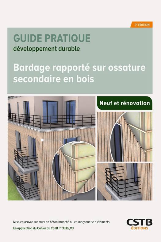 Ce guide détaille, commente et illustre les principes de mise en oeuvre de tous les éléments constituant un système de bardage rapporté sur une ossature secondaire en bois et définit les conditions de mise en oeuvre de l'ensemble des systèmes de revêtement rapporté sur une paroi verticale constituée de béton banché (conformément au DTU 23.1) ou de maçonnerie d'éléments (conformément au NF DTU 20.1) en application du e-Cahiers du CSTB n° 3316_V3 (mis à jour).