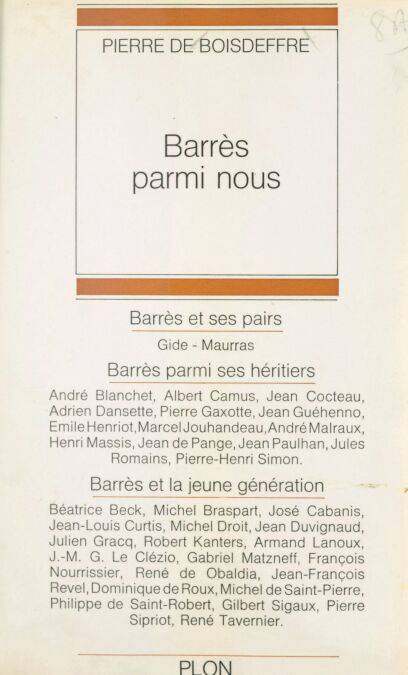 « Moins qu’une œuvre, Barrès nous offre une vie, qui s’est développée, comme toute existence humaine, sur le terreau des possibles manqués, mais une vie riche, faite d’équilibre entre l’intellect et l’affectivité, à la fois une et diverse, qui a prolongé sa ferveur jusqu’à l’instant de mourir ; si, dans sa vie publique, Barrès est resté en-deçà de ce qu’il aurait pu accomplir, le meilleur de son œuvre est une quête constante du Moi profond. « L’histoire, plus généreuse aux morts que les vivants, reconnaîtra en Barrès l’un de nos écrivains les plus attachants, sinon peut-être l’un des plus grands. » Il était important, nous a-t-il semblé, de republier aujourd’hui ce premier livre de Pierre de Boisdeffre, dont le dessein, selon le mot de l’auteur, n’est « ni de condamner ni d’absoudre, mais simplement d’appeler Barrès à siéger de nouveau parmi nous ». C’est pourquoi figurent, à la fin du volume, des témoignages sur Barrès récemment demandés à des écrivains, représentatifs de la jeune génération, parmi lesquels : Béatrice Beck, Jean-Louis Curtis, Julien Gracq, J.-M.-G. Le Clézio, François Nourissier, René de Obaldia, Michel de Saint-Pierre...