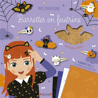 Ta pochette contient tout le matériel nécessaire pour réaliser 6 barrettes sur le thème d'Halloween : 6 barrettes (2 grandes et 4 petits), 1 feuille pailletée prédécoupée, 2 feutrines imprimées et 2 feutrines autocollantes.