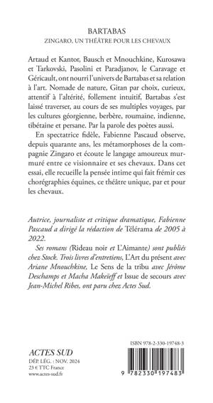 Artaud et Kantor, Bausch et Mnouchkine, Kurosawa et Tarkovski, Pasolini et Paradjanov, le Caravage et Géricault, ont nourri l'univers de Bartabas et sa relation à l'art. Nomade de nature, Gitan par choix, curieux, attentif à l'altérité, follement intuitif, Bartabas s'est laissé traverser, au cours de ses multiples voyages, par les cultures géorgienne, berbère, roumaine, indienne, tibétaine et persane. Par la parole des poètes aussi. En spectatrice fidèle, Fabienne Pascaud observe, depuis quarante ans, les métamorphoses de la compagnie Zingaro et écoute le langage amoureux murmuré entre ce visionnaire et ses chevaux. Dans cet essai, elle recueille la pensée intime qui fait frémir ces chorégraphies équines, ce théâtre unique, par et pour les chevaux.