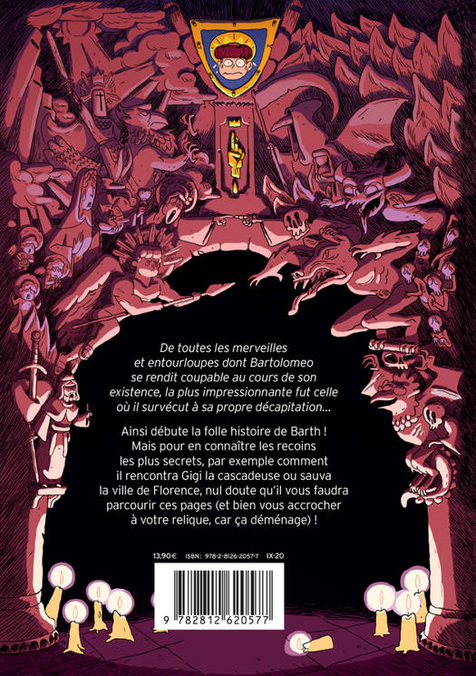 "De toutes les merveilles et entourloupes dont Bartolomeo se rendit coupable au cours de son existence, la plus impressionnante fut celle où il survécut à sa propre décapitation." Ainsi commence la plus invraisemblable des aventures, celle de Barth ! Ce moinillon de treize ans, qui a le pouvoir de léviter (en dormant), va devoir relever le plus grand des défis : mettre un terme à l'épidémie de peste qui ravage son beau pays, l'Italie. Mais au XVe siècle, les choses étaient un tout petit peu différentes d'aujourd'hui... un ogre voire un loup-garou n'avaient rien d'extraordinaire, les toutes jeunes filles pouvaient être cascadeuses professionnelles, les inventeurs de génie avoir une dizaine d'années et un enfant maudit être capable des bêtises les plus incroyables et des miracles les plus ép