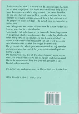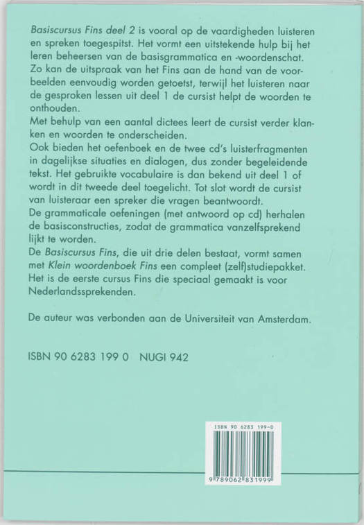 Basiscursus Fins deel 2 is vooral op de vaardigheden luisteren en spreken toegespitst. Het vormt een uitstekende hulp bij het leren beheersen van de basisgrammatica en -woordenschat. Zo kan de uitspraak van het Fins aan de hand van de voorbeelden eenvoudig worden getoetst, terwijl het luisteren naar de gesproken lessen uit deel 1 de cursist helpt de woorden te onthouden.