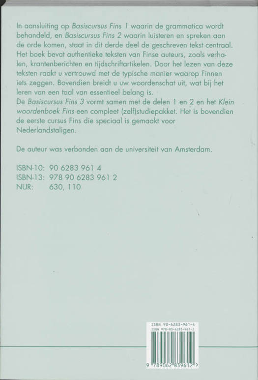 In dit derde deel van de Basiscursus Fins staat de geschreven tekst centraal. Het boek bevat authentieke teksten van Finse auteurs, waaronder verhalen, krantenberichten en tijdschriftartikelen. Door het lezen van deze teksten raakt de cursist vertrouwd met de Finse manier van uitdrukken. Daarnaast wordt hiermee de woordenschat en de grammatica uitgebreid, wat bij het leren van een nieuwe taal natuurlijk van groot belang is.