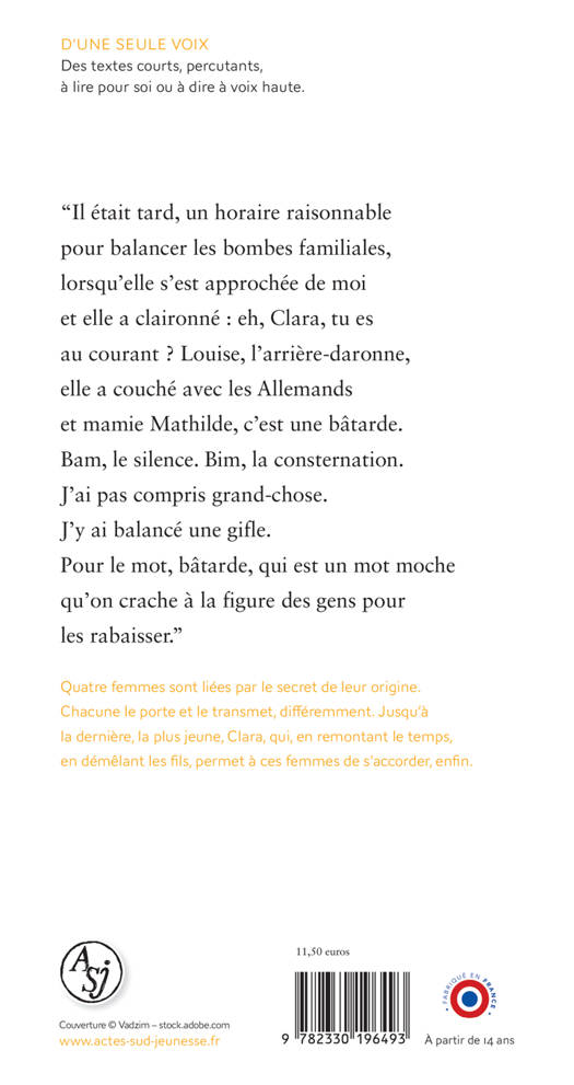 "Il était tard, un horaire raisonnable pour balancer les bombes familiales, lorsqu'elle s'est approchée de moi et elle a claironné : eh, Clara, tu es au courant ? Louise, l'arrière-daronne, elle a couché avec les Allemands et mamie Mathilde, c'est une bâtarde. Bam, le silence. Bim, la consternation. J'ai pas compris grand-chose. J'y ai balancé une gifle. Pour le mot, bâtarde, qui est un mot moche qu'on crache à la figure des gens pour les rabaisser."
