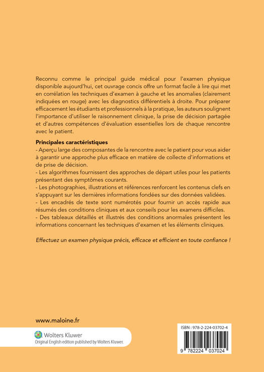 Reconnu comme le principal guide médical pour l’examen physique disponible aujourd’hui, cet ouvrage concis offre un format facile à lire qui met en corrélation les techniques d’examen à gauche et les anomalies (clairement indiquées en rouge) avec les diagnostics différentiels à droite. Pour préparer efficacement les étudiants et professionnels à la pratique, les auteurs soulignent l’importance d’utiliser le raisonnement clinique, la prise de décision partagée et d’autres compétences d’évaluation essentielles lors de chaque rencontre avec le patient. Principales caractéristiques - Aperçu large des composantes de la rencontre avec le patient pour vous aider à garantir une approche plus efficace en matière de collecte d’informations et de prise de décision. - Les algorithmes fournissent des approches de départ utiles pour les patients présentant des symptômes courants. - Les photographies, illustrations et références renforcent les contenus clefs en s’appuyant sur les dernières informations fondées sur des données validées. - Les encadrés de texte sont numérotés pour fournir un accès rapide aux résumés des conditions cliniques et aux conseils pour les examens difficiles. - Des tableaux détaillés et illustrés des conditions anormales présentent les informations concernant les techniques d’examen et les éléments cliniques.
