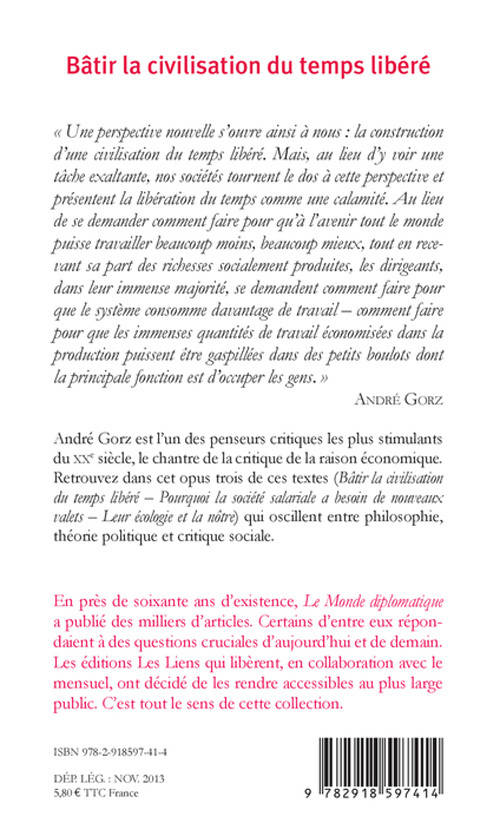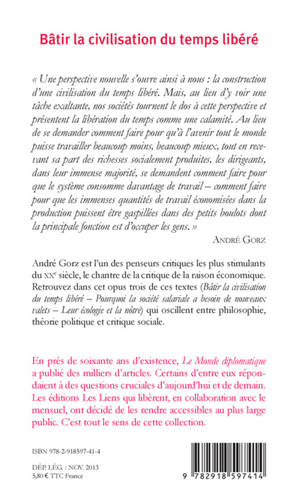 Dans ces textes, André Gorz pose la question d'une nouvelle civilisation : celle non plus de l'asservissement à la valeur du travail (les sociétés de plein emploi des Trente Glorieuses ne sont aujourd'hui plus possible) mais celle à l'inverse qui, parce qu'elle ouvre sur un temps libéré, modifiera radicalement nos manières de vivre.