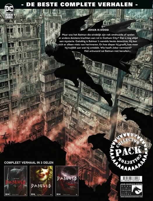 Batman: Damned Collector Pack Compleet is een wilde achtbaanrit en een bovennatuurlijke thriller! De Joker is dood. Daarover is iedereen het eens. Maar was het Batman die eindelijk zijn nek omdraaide of spelen er andere duistere machten een rol in Gotham City? Dat is nog altijd een mysterie. Gelukkig is Batman 's werelds beste detective. Batman kan zich er alleen niets van herinneren. En hoe dieper hij graaft in zijn geheugen, hoe meer hij twijfelt aan alles wat hij ontdekt. Hij heeft hulp nodig en aan wie kan hij dat beter vragen dan John Constantine? John is gek op raadsels? maar het probleem is dat hij ook gek is op spelletjes. Spelletjes met anderen. Samen met John duikt Batman in de schimmige onderwereld van Gotham. Wie heeft Joker vermoord? Het antwoord zal Batman niet bevallen?