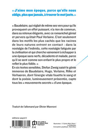 "Baudelaire, qui réglait de même ses vers pour qu'ils provoquent un effet puissant, n'a rien de commun, dans sa retenue élégante, avec ce romanichel génial et pervers qu'était Paul Verlaine. C'est seulement dans les motifs les plus cachés que les racines de leurs natures entrent en contact : dans la nostalgie de l'individu, cette nostalgie fatiguée par la civilisation et qui cherche vainement à échapper à une époque sans nerfs, décadente et malade, parce qu'il se sent comme son enfant le plus propre et le reflet le plus fidèle." En six textes sensibles, Stefan Zweig saisit l'immense génie de Baudelaire, Hugo, Verlaine, Rilke et Verhaeren, dont l'énergie vitale fouette le sang et dont la poésie, lumineusement présentée, capte tous les "mouvements secrets" d'une époque.