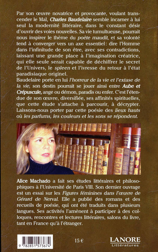 Par son oeuvre novatrice et provocante, voulant transcender le Mal, Charles Baudelaire semble incarner à lui seul la modernité littéraire, dans le constant désir d'ouvrir des voies nouvelles. Sa vie tumultueuse, pourrait nous inspirer le thème du poète maudit, et sa volonté tend à converger vers un axe essentiel ; dire l'Homme dans l'infinitude de son être, avec ses contradictions, laissant une grande place à l'imagination créatrice, qui elle seule serait capable de déchiffrer le secret de l'Univers, le spleen et l'ivresse du retour à l'état paradisiaque originel. Baudelaire porte en lui l'horreur de la vie et l'extase de la vie, son destin pourrait se jouer ainsi entre Aube et Crépuscule, ange ou démon, paradis ou enfer. C'est l'étendue de son oeuvre, diversifiée, ses affinités spirituelles, que cette étude s'attache à parcourir, à décrypter. Laissons-nous porter par cette poésie des lieux hauts où les parfums, les couleurs et les sons se répondent.