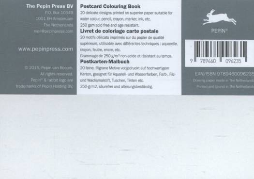 20 delicate designs printed on superior paper suitable for watercolour, pencil, crayon, marker, ink, etc; 250gsm acid free and age resistant.