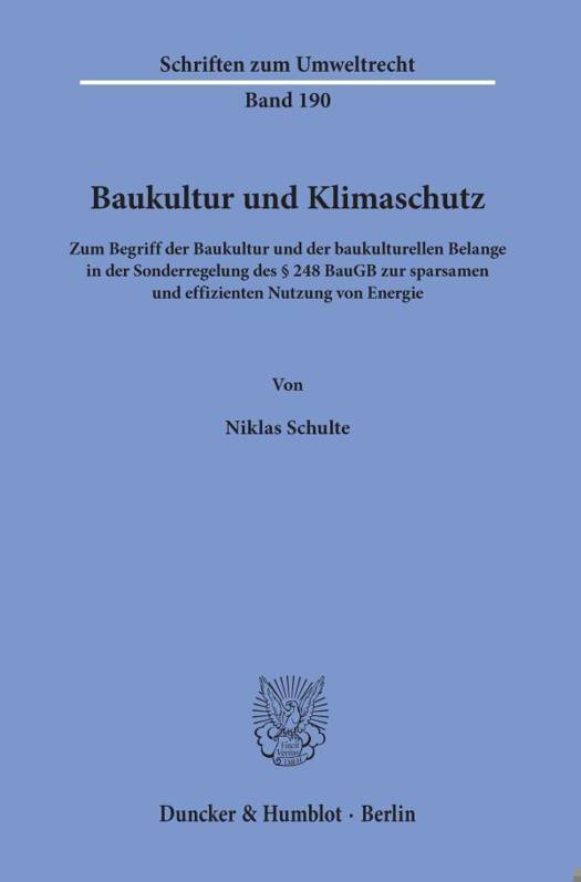 Die Vereinbarkeit von (inter-)nationalen Klimaschutzzielen mit den Belangen der Baukultur stellt Eigentumer, Bauherren, Architekten sowie Bauverwaltungen vor neue Aufgaben und Herausforderungen im Stadtebau. Der Bundesgesetzgeber versucht diese Herausforderungen mit der Sonderregelung 248 BauGB als spezielle bauplanungsrechtliche Abweichungsvorschrift zu bewaltigen und den Konflikt zwischen Baukultur und Klimaschutz zu losen. Ziel der Arbeit ist es, die unbestimmten Rechtsbegriffe der Baukultur und der baukulturellen Belange in der Sonderregelung 248 BauGB als Begriffe des Bodenrechts in Abgrenzung zum Bauordnungs- und Denkmalschutzrecht der Lander zu konkretisieren und verfassungskonform auszulegen. Wesentliche Bedeutung fur die Auslegung kommt dem Begriff der Kultur im Rechtssinne sowie dem Baugestaltungs- und Denkmalrecht zu. Die Arbeit nimmt zu der Frage Stellung, ob der Eingriff durch 248 BauGB in die Planungshoheit der Gemeinde (Art. 28 Abs. 2 GG) gerechtfertigt ist.