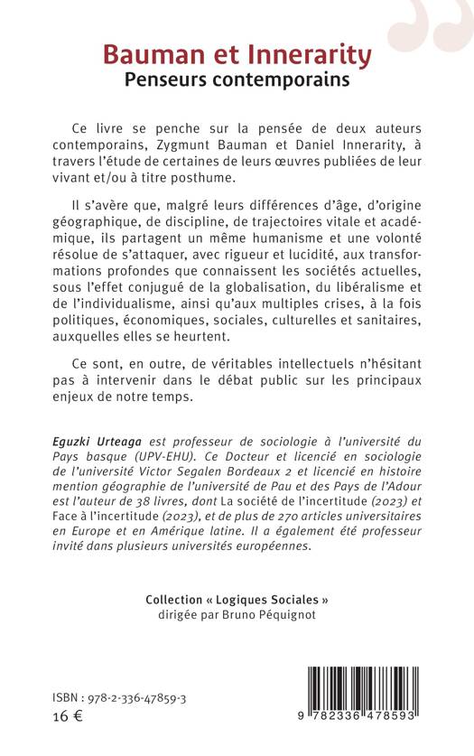 Ce livre se penche sur la pensée de deux auteurs contemporains, Zygmunt Bauman et Daniel Innerarity, à travers l'étude de certaines de leurs oeuvres publiées de leur vivant et/ou à titre posthume. Il s'avère que, malgré leurs différences d'âge, d'origine géographique, de discipline, de trajectoires vitale et académique, ils partagent un même humanisme et une volonté résolue de s'attaquer, avec rigueur et lucidité, aux transformations profondes que connaissent les sociétés actuelles, sous l'effet conjugué de la globalisation, du libéralisme et de l'individualisme, ainsi qu'aux multiples crises, à la fois politiques, économiques, sociales, culturelles et sanitaires, auxquelles elles se heurtent. Ce sont, en outre, de véritables intellectuels n'hésitant pas à intervenir dans le débat public sur les principaux enjeux de notre temps.