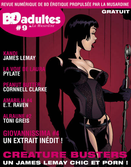 Déjà le numéro 9 de votre revue érotique BD-Adultes, et encore plein d'extraits inédits à vous mettre sous la dent ! Une histoire complète de Giovannissima – Tome 4, dernière parution Dynamite, mais aussi Creature Busters, la nouveauté monster porn signée James Lemay, et la romance lesbienne d'Amabilia #4... Et puis, bien sûr, la suite de vos histoires préférées : le gangbang zombie de Kandi (Kandi, last girl on earth), le tournage porno de Dinah, rendue nympho par une malédiction (Alraune – Tome 2), les soirées étudiantes au parfum d'orgies interraciales de Molly (Peanut Butter #2) et le début de la soumission de Laura, offerte à ses geôliers (La Voie de Laura)... Tout un programme !