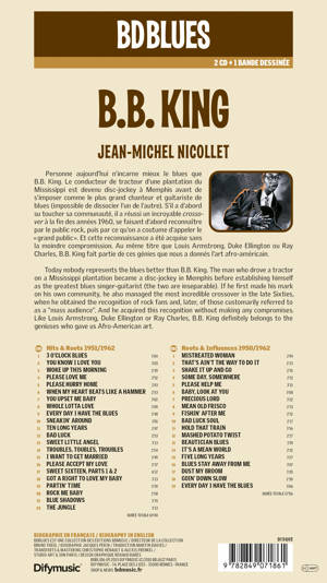 La biographie de B B King par Jacques Perrin, illustrée par Jean Michel Nicollet et accompagnée d'1 compacts disc<br /> B.B. KING<br /> Personne aujourd'hui n'incarne mieux le blues que B.B. King. Le conducteur de tracteur d'une plantation du Mississippi est devenu disc-jockey à Memphis avant de s'imposer comme le plus grand chanteur et guitariste de blues (impossible de dissocier l'un de l'autre). S'il a d'abord su toucher sa communauté, il a réussi un incroyable crossover à la fin des années 1960, se faisant d'abord reconnaître par le public rock, puis par ce qu'on a coutume d'appeler le "grand public". Et cette reconnaissance a été acquise sans la moindre compromission. <br /> Au même titre que Louis Armstrong, Duke Ellington ou Ray Charles, B.B. King fait partie de ces génies que nous a donnés l'art afro-américain. <br /> CD ~ LES SUCCÈS – THE HITS <br /> 1. 3 O’CLOCK BLUES (Riley B. King, Jules Taub) 3’04<br /> 2. WOKE UP THIS MORNING (Riley B. King, Jules Taub) 2’59<br /> 3. PLEASE LOVE ME (Riley B. King, Jules Taub) 2’52<br /> 4. PLEASE HURRY HOME (Riley B. King, Jules Taub) 2’43<br /> 5. YOU UPSET ME BABY (Riley B. King, Jules Taub) 3’02<br /> 6. WHOLE LOTTA LOVE (Maxwell Davis, Joe Josea) 3’09<br /> 7. EVERY DAY I HAVE THE BLUES (Peter Chatman) 2’48<br /> 8. BAD LUCK (Ivory Joe Hunter) 2’53<br /> 9. PARTIN’ TIME (Riley B. King, Joe Josea) 2’59<br /> 10. ROCK ME BABY (Melvin Jackson) 2’58<br /> 11. THE JUNGLE (Riley B. King, Joe Josea) 3’13<br /> RACINES ET INFLUENCES – ROOTS & INFLUENCES<br /> 12. MISTREATED WOMAN (Riley B. King, Jules Taub) 2’49<br /> 13. THAT’S AIN’T THE WAY YOU DO IT (Riley B. King, Jules Taub) 2’23<br /> 14. MEAN OLD FRISCO (Arthur Crudup) 2’33<br /> 15. FISHIN’ AFTER ME (Robert Petway) 2’32<br /> 16. BAD LUCK SOUL (Blind Lemon Jefferson, arr. Riley B. King, Joe Josea) 2’17<br /> 17. HOLD THAT TRAIN (Peter Joe Clayton) 3’56<br /> 18. MASHED POTATO TWIST (Riley B. King) 2’27<br /> 19. BEAUTICIAN BLUES (Roy Brown) 1’59<br /> 20. IT’S A MEAN WORLD (T-Bone Walker) 2’32<br /> 21. FIVE LONG YEARS (Eddie Boyd) 3’27<br /> 22. DUST MY BROOM (Elmore James) 3’20<br /> 23. GOIN’ DOWN SLOW (St. Louis Jimmy Oden) 2’50<br /> 24. EVERY DAY I HAVE THE BLUES (Peter Chatman) 5’06<br /><br /><br /><br />