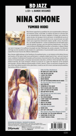 Une biographie de Nina Simone, écrite par Bruno Théol, illustrée par Yumiko Hioki, en version de poche, accompagnée d’1 compact discs. Nina Simone appartient au panthéon des voix exceptionnelles et demeure une immense artiste, inclassable. Sa maîtrise du piano et sa ferveur font de ses interprétations des oeuvres originales et uniques qui croisent les univers du jazz, du classique et de la soul music. Le tourbillon de succès et de descentes aux enfers qui a caractérisé sa vie, ne peut trouver son explication qu’au regard des événements majeurs qu’elle a vécus. En premier lieu, une double bénédiction : un don exceptionnel et une formation rigoureuse de pianiste classique, puis trois épreuves douloureuses : le refus du Curtis Institute de Philadelphie de parfaire sa formation, le départ d’Andy son mari et manager et la souffrance du peuple noir dans l’Amérique des années soixante. Ces éléments ont forgé une des vocalistes les plus douées de sa génération et la personnalité la plus controversée, qui aujourd’hui encore fascine des millions d’admirateurs. CD Nina Simone 1957 - 1962 Little Girl Blue (Bethlehem) 1. My Baby Just Cares For Me (Kahn, Donaldson)3’37 2 Love Me or Leave Me (Kahn, Donaldson)3’21 3 I Loves You Porgy (Gershwin, Gershwin)4’09 4 Little Girl Blue (Rodgers, Hart)4’18 5 Mood Indigo (Mills, Ellington, Bigard)4’01 6 He’s Got the Whole World in his Hands (trad. arr. Simone)3’10 New York, 1957, Nina Simone (vcl, p); Jimmy Bond (b); Albert “Tootie” Heath The Amazing Nina Simone (Colpix) 7 Blue Prelude (Jenkins, Bishop)3’21 8 Stomping at the Savoy (Goodman, Webb, Sampson, Razaf)2’10 9 You’ve Been Gone Too Long (Sellers)2’12 10 Can’t Get Out Of This Mood (Loesser, McHugh)2’33 11 Willow Weep For Me (Ronell)3’13 New York, 1959, Nina Simone (vcl, p); acc by a large orchestra, Bob Mersey (dir) Other details unknown Nina Simone At Town Hall (Colpix) 12 Exactly Like You (Loehner, Fields, McHugh)3’13 13 The Other Woman (Robinson)3’01 14 I Don’t Want Him (Anymore) (Enloe)5’48 15 Summertime (Gershwin, Gershwin, Heyward)’5’35 16 Wild is The Wind (Tiomkin, Washington)3’27 17 Fine And Mellow (Holiday)3’32 New York, September 12, 1959, Concert at Town Hall, Nina Simone (vcl, p); Jimmie Bond (b); Albert “Tootie” Heath (d) Forbidden Fruit (Colpix) 18. Work Song (Adderley, Brown)2’36 19. Just Say I Love Him (Kalmanoff, Val, Dale)6’38 New York, 1961, Nina Simone (vcl, p) Al Shackman (g); Chris white (b); Bobby Hamilton (d) Nina Simone Sings Duke Ellington (Colpix) 20. Do Nothin’ Till You Hear From Me (Ellington)2’49 21. Something To Live For (Ellington)2’55 22. It Don’t Mean a Thing (Ellington)2’30 New York, 1962, Nina Simone (vcl, p); acc by Big Band & The Malcolm Dodds Singers.