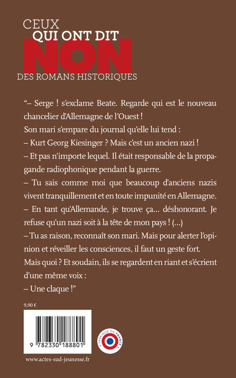 Novembre 1968. Le nouveau chancelier d'Allemagne assiste à un congrès politique. Une jeune inconnue se faufile derrière son siège et vlan, elle lui assène une gifle magistrale. Cette téméraire rappelle ainsi au monde entier que Kurt Georg Kiesinger était un haut responsable du IIIe Reich, et qu'il doit payer pour ses crimes. Beate Klarsfeld n'en est qu'à son coup d'essai. Elle a tout manigancé avec Serge, son mari. C'est lui l'historien, marqué dans sa chair par l'Holocauste, qui lui a fait ouvrir les yeux sur les horreurs du nazisme. Ensemble, ils ne vont cesser de pourfendre les responsables des persécutions contre les Juifs pour qu'ils soient traduits en justice. De la traque de Klaus Barbie à celle de Kurt Lishka, en passant par la rédaction du Mémorial de la déportation qui recense les noms des milliers de déportés partis de France vers les camps, nous accompagnons ce couple aussi soudé qu'obstiné, qui jamais, jamais ne renonce. Parce que les actions de Serge et Beate Klarsfeld ont ponctué toute son existence et inspirent son travail d'écrivain, Rachel Hausfater a voulu rendre hommage à ce couple extraordinaire, au sens propre du terme. Un roman qui nous enjoint à ne jamais laisser triompher les assassins, et à ne cesser de combattre l'antisémitisme.