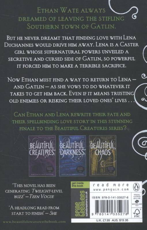 One night in the rain, Ethan Wate opened his eyes and fell in love with Lena Duchannes. His life would never be the same. Ethan always dreamed of leaving the stifling Southern town of Gatlin. But he never dreamt that finding love with Lena Duchannes would drive him away.
