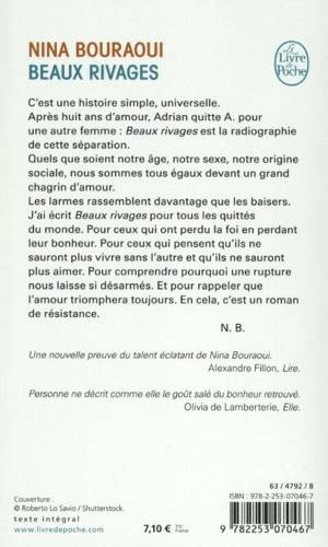 C'est une histoire simple, universelle. Après huit ans d'amour, Adrian quitte A. pour une autre femme : Beaux rivages est la radiographie de cette séparation. Quels que soient notre âge, notre sexe, notre origine sociale, nous sommes tous égaux devant un grand chagrin d'amour. Les larmes rassemblent davantage que les baisers. J'ai écrit Beaux rivages pour tous les quittés du monde. Pour ceux qui ont perdu la foi en perdant leur bonheur. Pour ceux qui pensent qu'ils ne sauront plus vivre sans l'autre et qu'ils ne sauront plus aimer. Pour comprendre pourquoi une rupture nous laisse si désarmés. Et pour rappeler que l'amour triomphera toujours. En cela, c'est un roman de résistance. N. B.