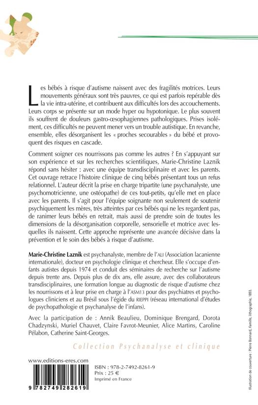 Les bébés à risque d’autisme naissent avec des fragilités motrices. Leurs mouvements généraux sont très pauvres, ce qui est parfois repérable dès la vie intra-utérine, et contribuent aux difficultés lors des accouchements. Leurs corps se présente sur un mode hyper ou hypotonique. Le plus souvent ils souffrent de douleurs gastro-œsophagiennes pathologiques. Prises isolément, ces difficultés ne peuvent mener vers un trouble autistique. En revanche, ensemble, elles désorganisent les « proches secourables » du bébé et provoquent des risques en cascade. Comment soigner ces nourrissons pas comme les autres ? En s’appuyant sur son expérience et sur les recherches scientifiques, Marie-Christine Laznik répond sans hésiter : avec une équipe transdisciplinaire et avec les parents. Cet ouvrage retrace l’histoire clinique de cinq bébés présentant tous un refus relationnel. L’auteur décrit la prise en charge tripartite (une psychanalyste, une psychomotricienne, une ostéopathe) de ces tout-petits, qu’elle met en place avec les parents. Il s’agit pour l’équipe soignante non seulement de soutenir psychiquement les mères, très atteintes par ces bébés qui ne les regardent pas, de ranimer leurs bébés en retrait, mais aussi de prendre soin de toutes les dimensions de la désorganisation corporelle, sensorielle et motrice avec lesquelles ils naissent. Cette approche, évaluée scientifiquement, représente une avancée décisive dans la prévention et le soin des bébés à risque d’autisme.