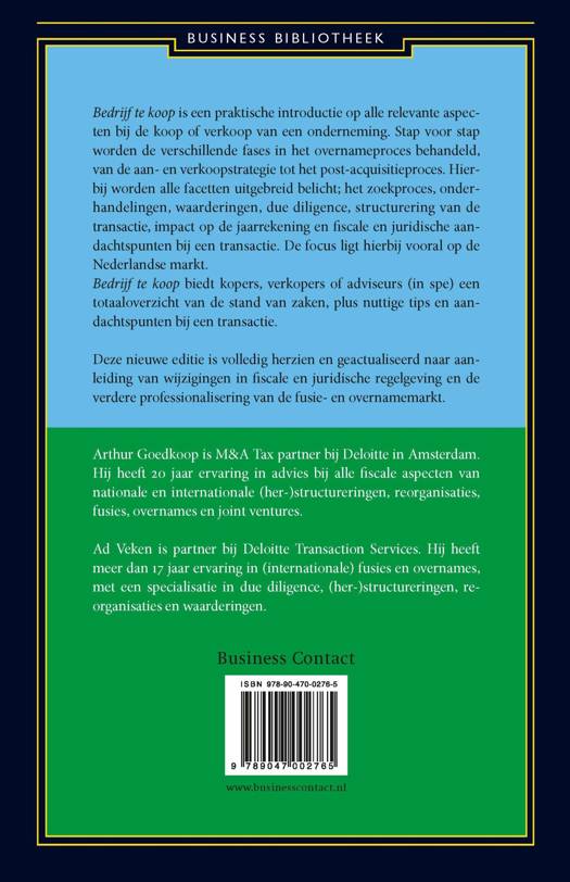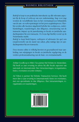 Bedrijf te koop biedt een praktische introductie op alle relevante aspecten bij de koop of verkoop van een onderneming. Stap voor stap worden de verschillendefases in het overnameproces behandeld; van de aan- en verkoopstrategie tot het post-acquisitieproces. Verkopers, kopers of adviseurs (in spe) krijgen middels Bedrijf te koop een actueel totaaloverzicht van de stand van zaken, plus nuttige tips en aandachtspunten bij een transactie. Hierbij worden alle facetten uitgebreid belicht; de strategie en het zoekproces, onderhandelingen, waarderingen, due diligence, structurering van de transactie, impact op de jaarrekening en fiscale en juridische aandachtspunten bij een transactie. De focus ligt hierbij op de Nederlandse markt. Deze nieuwe editie is grondig herzien ten opzichte van de vorige en geactualiseerd naar aanleiding van wijzigingen in fiscale en juridische regelgeving en de verdere professionalisering van de fusie- en over - namemarkt.