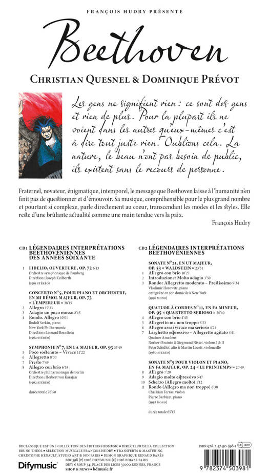 La biographie de Ludwig van Beethoven, écrite par François Hudry, illustrée par Christian Quesnel, accompagnée de 2 compacts discs. BEETHOVEN<br /><br /> "Les gens ne signifient rien : ce sont des gens et rien de plus. Pour la plupart ils ne voient dans les autres qu'eux-mêmes c'est à dire tout juste rien. Oublions cela. La nature, le beau n'ont pas besoin de public, ils existent sans le recours de personne."<br /> Beethoven (1812)<br /><br /> Fraternel, novateur, énigmatique, intemporel, le message que Beethoven laisse à l'humanité n'en finit pas de questionner et d'émouvoir. Sa musique, compréhensible pour le plus grand nombre et pourtant si complexe, parle directement au coeur, transcendant les modes et les styles. Elle reste d'une brûlante actualité comme une main tendue vers la paix. <br /><br /> François Hudry<br />